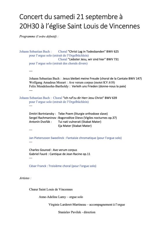 Concert Orgue & Choeur le samedi 21 septembre 2019 à 20H30 à l'église Saint Louis : Bach, Mozart, Mendelssohn, Bortniansky, Rachmaninov, Dvorak, Gounod, Fauré